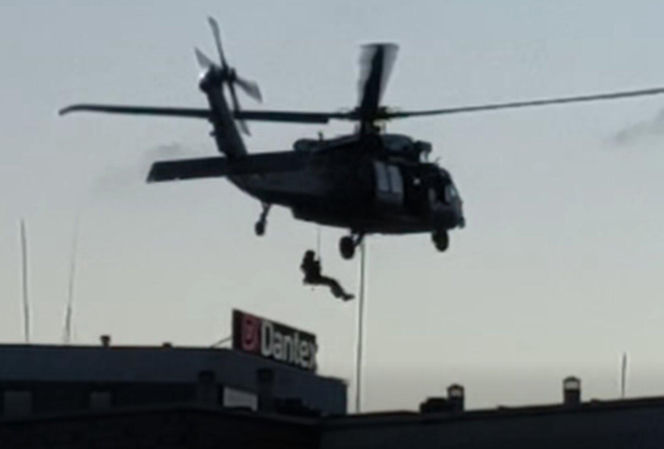 Akcja policjantów z użyciem śmigłowca Black Hawk o poranku w Warszawie